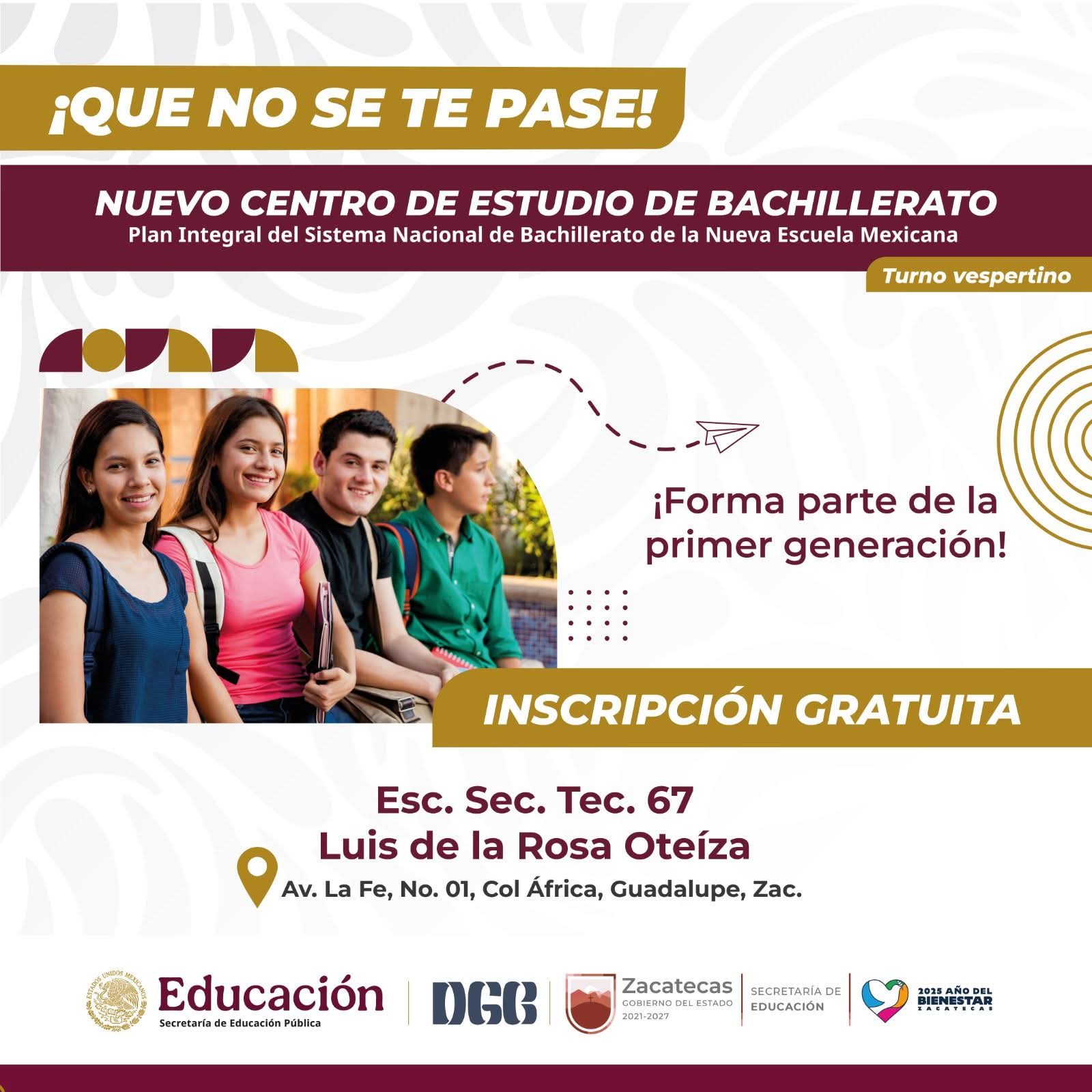 Continúa abierta la convocatoria para inscribirse, en el ciclo escolar 2025-2026, en el nuevo plantel de educación media superior, que estará bajo el subsistema de la Dirección General de Bachillerato (DGB), y que se instalará en Guadalupe.