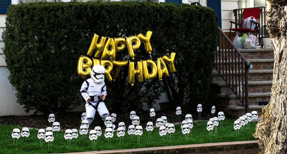 Emily y Dan Goodman decidieron combinar una serie de actividades seguras para su hijo, un ávido fan de Star Wars, como una búsqueda del tesoro con distanciamiento social, bailar en la calle con su disfraz de Storm Trooper junto a sus amigos a una distancia a prueba de contagios y una fiesta virtual por Zoom con entrega de golosinas a las casas de los amigos.