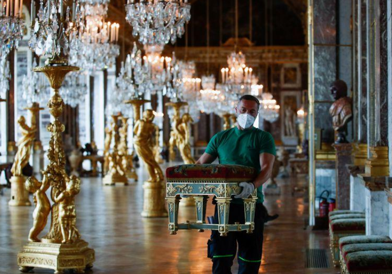 Los trabajadores desempolvaron el viernes el Salón de los Espejos y pulieron sus estatuas doradas antes de la reapertura, que requerirá que los visitantes usen mascarillas y sigan un recorrido unidireccional a través del opulento palacio de 2.300 habitaciones.
