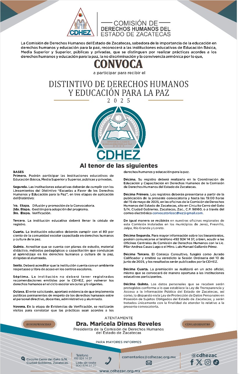 La Comisión de Derechos Humanos del Estado de Zacatecas (CDHEZ) convoca a instituciones de educación básica, media superior y superior, tanto públicas como privadas, a obtener el Distintivo de Derechos Humanos y Educación para la Paz.