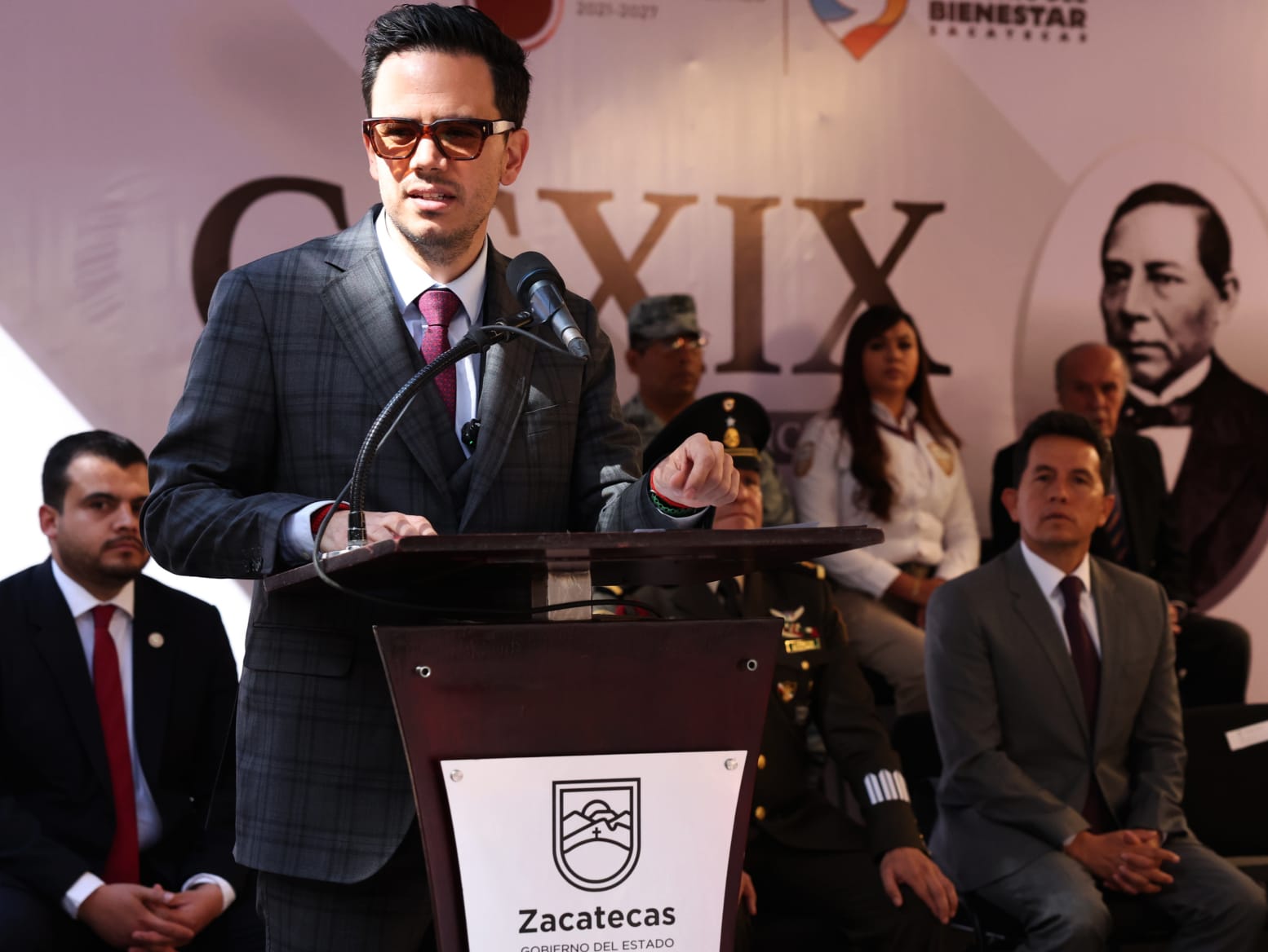 Zacatecas, Zac., 21 de marzo de 2025.- Durante la ceremonia cívica por el 219 aniversario del Natalicio del Benemérito de las Américas, Benito Juárez García, en representación del Gobernador David Monreal Ávila, el Secretario General de Gobierno, Rodrigo Reyes Mugüerza, destacó que, desde el inicio de la actual administración, Zacatecas vive una transformación profunda en los 58 municipios para avanzar a la pacificación y el bienestar social.