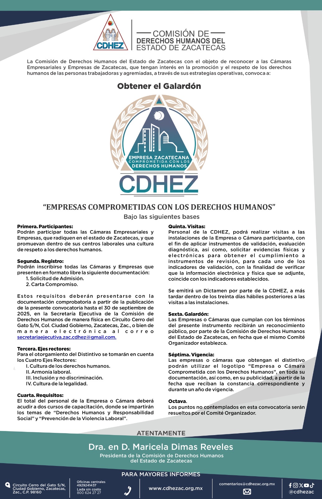 La Comisión de Derechos Humanos del Estado de Zacatecas (CDHEZ) invita a las Cámaras Empresariales y a las Empresas establecidas en la entidad a participar en la convocatoria para obtener el Galardón “Empresas Comprometidas con los Derechos Humanos 2025”, dirigido a aquellas que promueven una cultura de respeto y protección de los derechos humanos dentro de sus centros laborales.