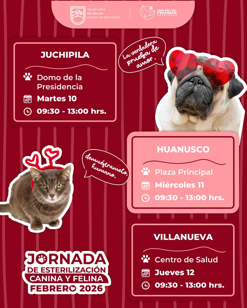 Como parte de la Agenda del Progreso, la SSZ llevará la Jornada Permanente de Esterilización Canina y Felina a Juchipila, el martes 10 de febrero, con la instalación de un módulo en el Domo de la Presidencia Municipal; el miércoles 11, estará en la Plaza Principal de Huanusco; en tanto que el jueves 12, los procedimientos se ofrecerán en el Centro de Salud Villanueva.