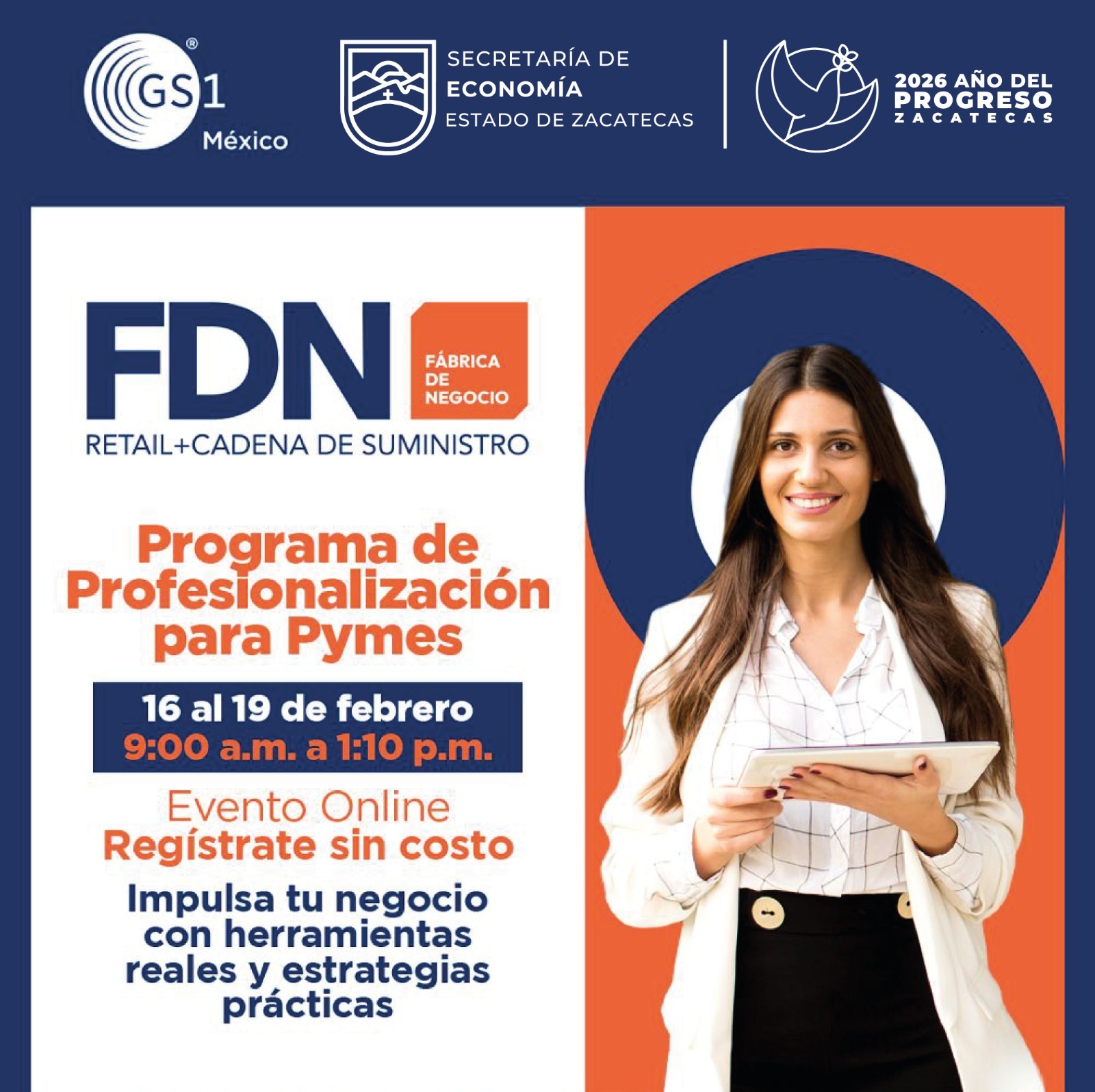 Zacatecas, Zac.- Con el objetivo de fortalecer a los negocios locales y brindarles herramientas que impulsen su crecimiento y competitividad, el Gobierno de Zacatecas, en conjunto con GS1 México, invita a empresarias, empresarios y emprendedores a participar en la capacitación en línea “Profesionalización de Empresas”, que se llevará a cabo del 16 al 19 de febrero, de 09:00 a 13:00 horas.