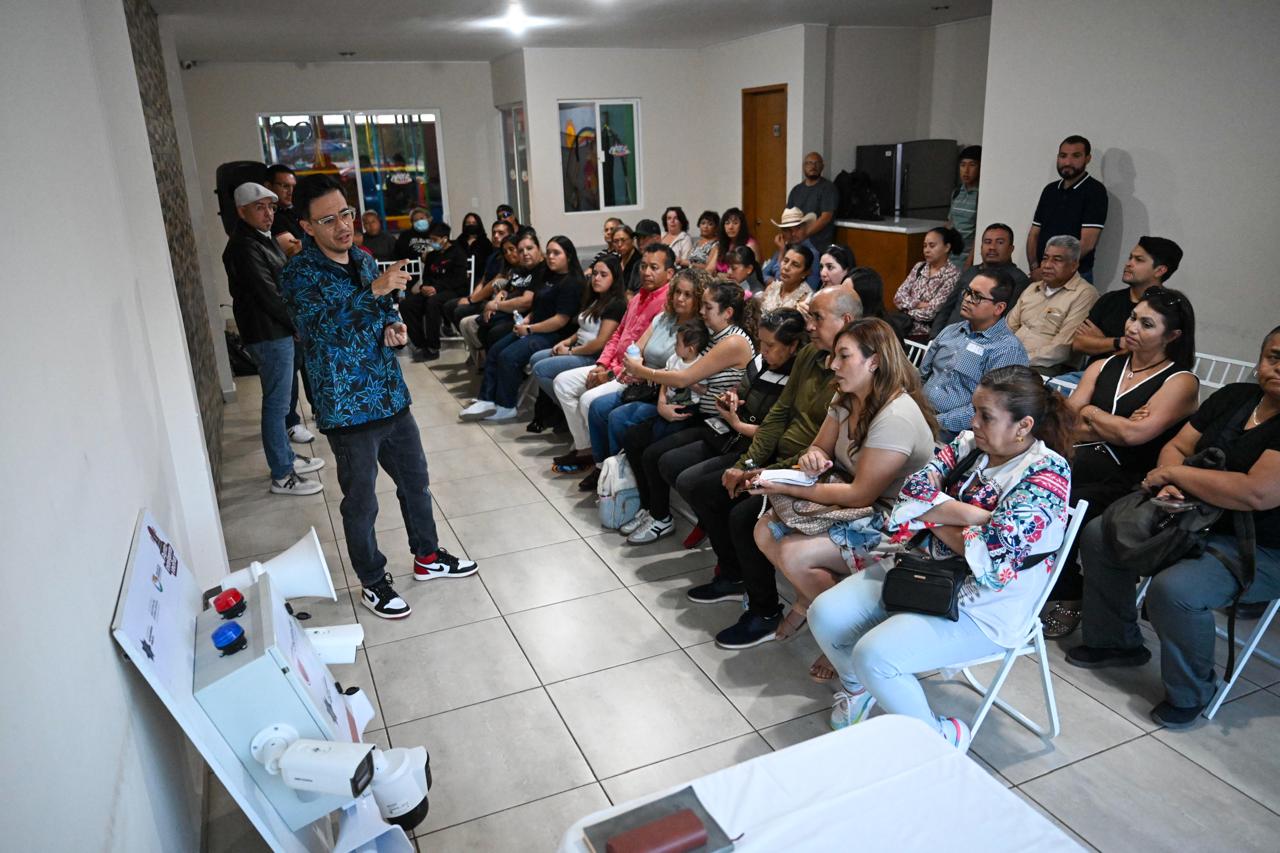 Rodrigo Reyes explicó a las y los colonos de Colinas del Padre que Punto Inteligente Vecinal consiste en la instalación de videovigilancia inteligente, con análisis automatizado, a través de la cual, mediante una aplicación móvil, las y los usuarios pueden emitir alertas de emergencia con geolocalización; incluso, la tecnología permite detectar rostros y placas de circulación de vehículos y altavoces.