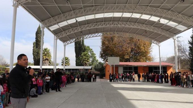 Jerez de García Salinas, Zac.- Con la presencia de casi 300 alumnos de la escuela Primaria Ignacio Zaragoza en la comunidad Ermita de Guadalupe, se entregó en Jerez un domo construido a través del Programa 2×1 Trabajando Unidos con los Migrantes, ejercicio 2019.