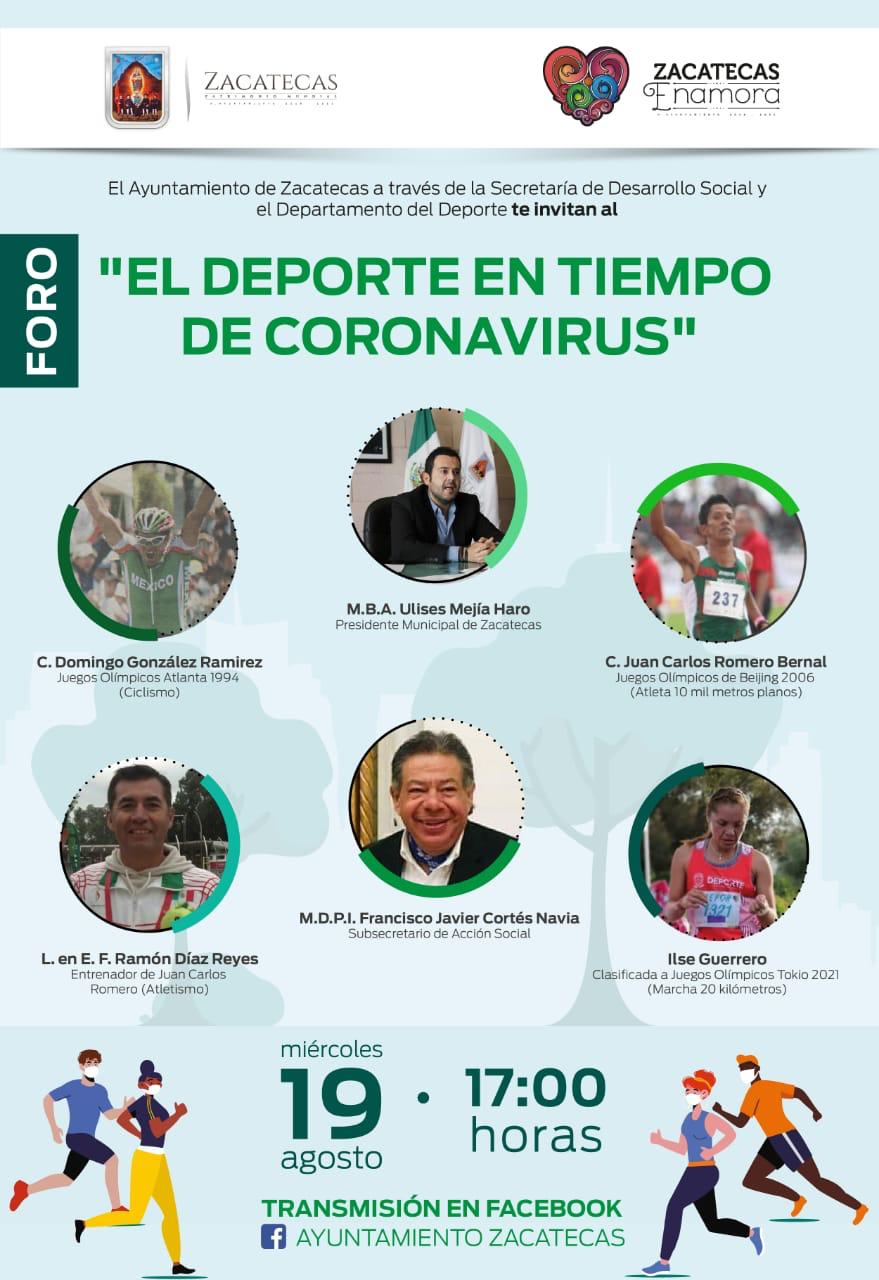Zacatecas ha sido la cuna de múltiples atletas, y el deporte es indispensable para el desarrollo de las ciudades. Detectar, apoyar e impulsar talentos deportivos no es un tema ligero y la pandemia ocasionada por el COVID-19, representa un obstáculo a la forma clásica de hacer deporte. Por ello, con los retos de adaptación por delante y los diferentes escenarios municipal, estatal y nacional sobre el tema deportivo, se reunirán expertos en el tema a través de un conversatorio digital con el alcalde Ulises Mejía Haro, titulado "El deporte en tiempos de coronavirus", que se llevará a cabo el próximo miércoles 19 de agosto a las 17:00 horas por la página oficial de facebook del Ayuntamiento de Zacatecas.