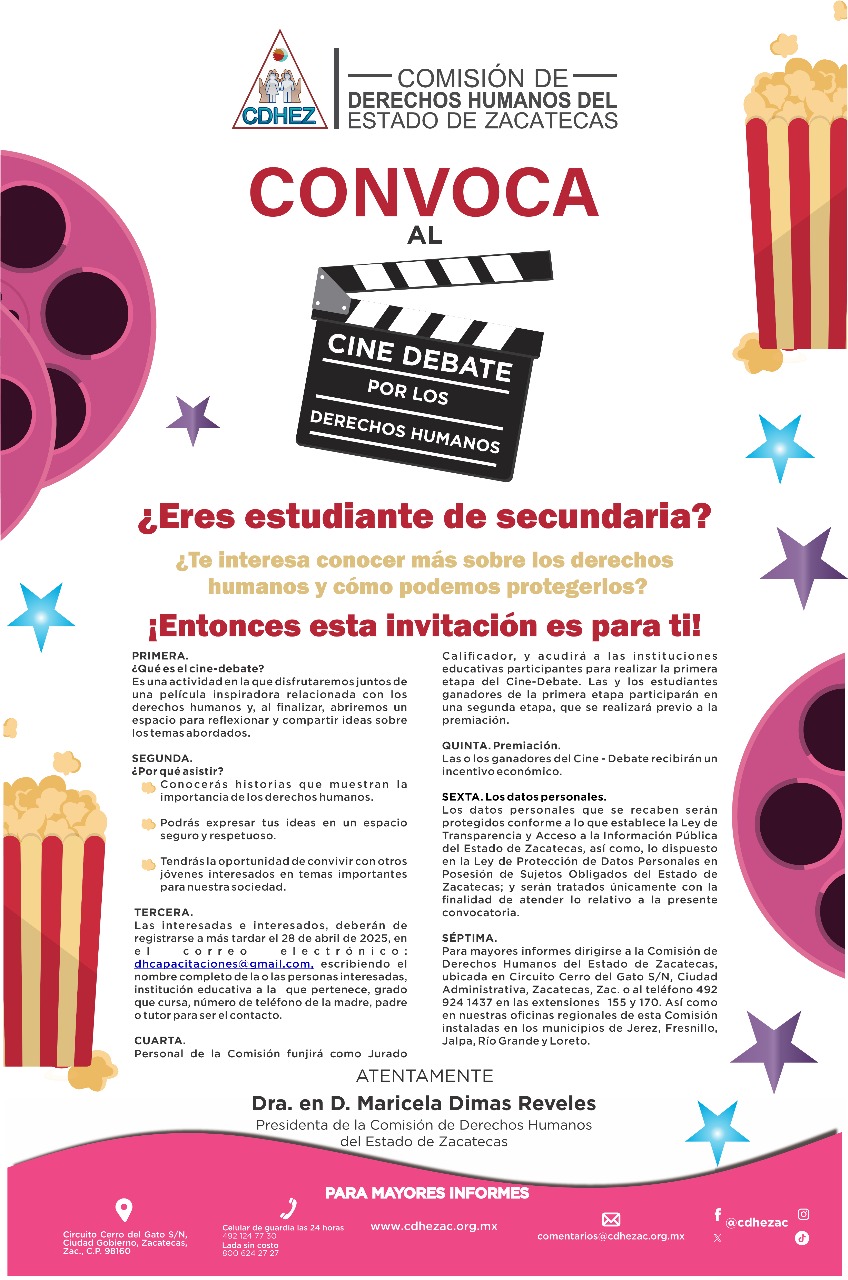 La Comisión de Derechos Humanos del Estado de Zacatecas (CDHEZ), convoca a las y los estudiantes de nivel secundaria, a participar en el Cine Debate por los Derechos Humanos, como un espacio de reflexión sobre temas de interés para las juventudes zacatecanas.