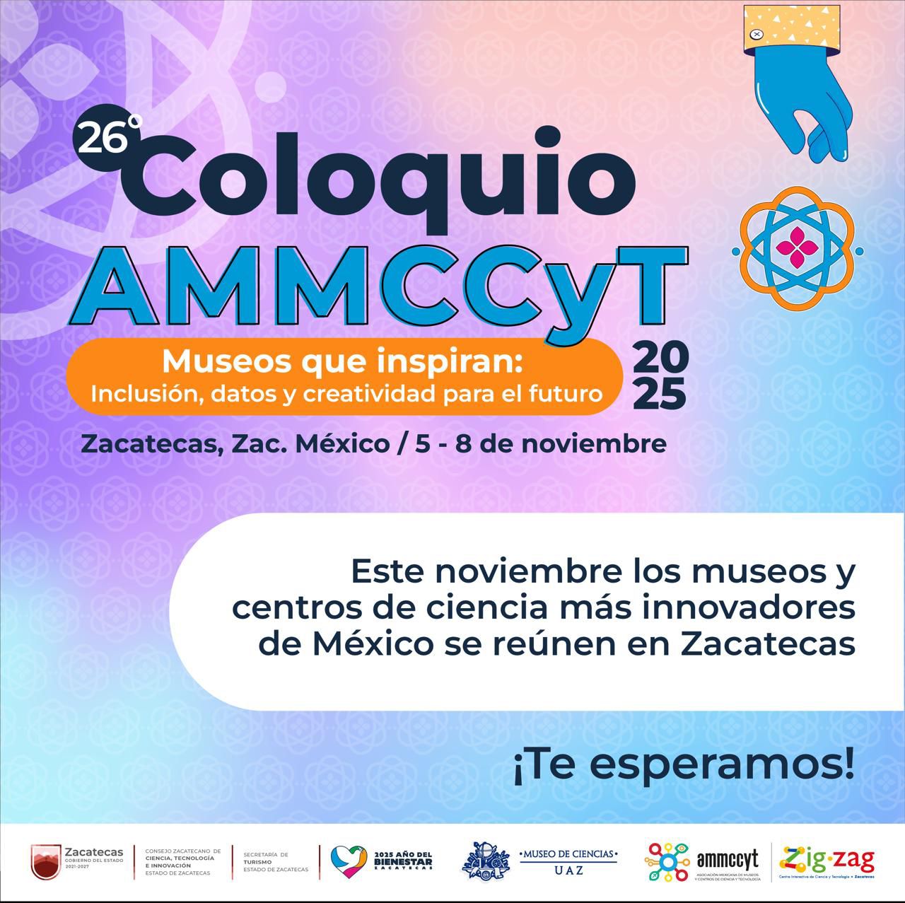 Zacatecas, Zac.- Con la participación de conferencistas, talleristas y ponentes de Colombia, Estados Unidos, Aguascalientes, Durango, Zacatecas, del Instituto Politécnico Nacional (IPN) y la Universidad Autónoma de Zacatecas (UAZ), entre otros, se realizará el 26 Coloquio de la Asociación Mexicana de Museos y Centros de Ciencia y Tecnología (AMMCCyT) 2025.