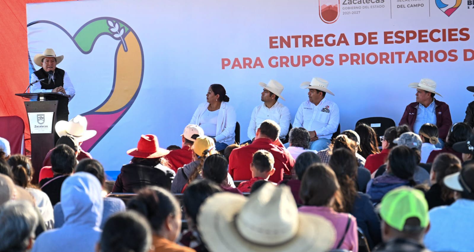 Como parte del Programa de Atención a Grupos Prioritarios del Medio Rural, el mandatario estatal entregó apoyos a 380 beneficiarias y beneficiarios de diversas comunidades de Pinos, con una derrama económica total de 1 millón 693 mil 145 pesos. De esto, 815 mil 271 pesos fueron aportados por el Gobierno del Estado y 577 mil 903 pesos por el Ayuntamiento de Pinos y beneficiarios.