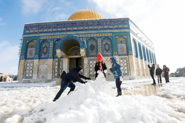 Los fieles tuvieron que caminar penosamente a través de varios centímetros de nieve para llegar a los lugares sagrados en la Ciudad Vieja amurallada de Jerusalén, incluida la Cúpula de la Roca y el Muro Occidental.