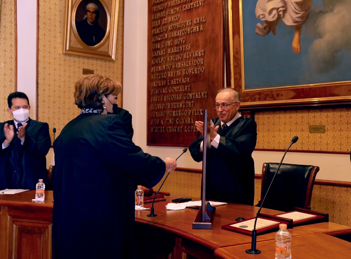 “21 de los 35 años de este fructífero peregrinar lo compartió con la docencia, formando buenas abogadas y buenos abogados, como ella, algunos de ellos, ahora ya compañeros nuestros en esta noble institución; y simultáneamente formando y consolidando una maravillosa familia”, le refirió el Magistrado Presidente.
